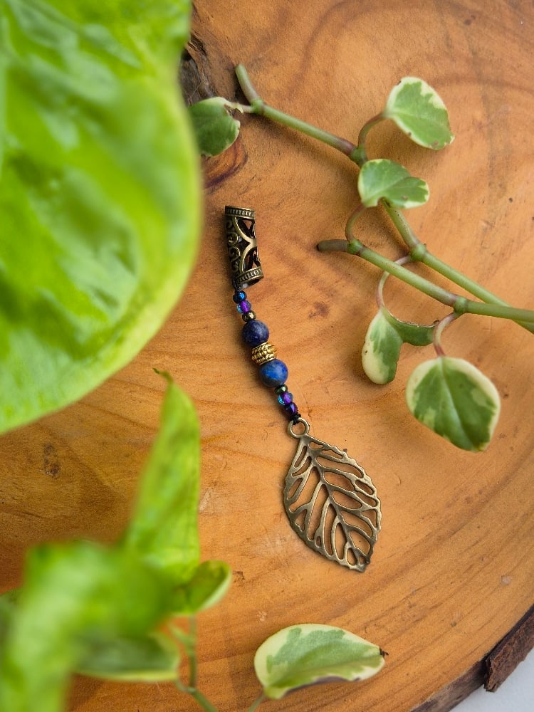 Gorgeous dreadlock dangle in bronze and blues, with a leafy charm. Crafted here at Riverbed Dreads. Featuring Sodalite crystal and a glass to add a touch of magic and eye-catching detail to your dreads!