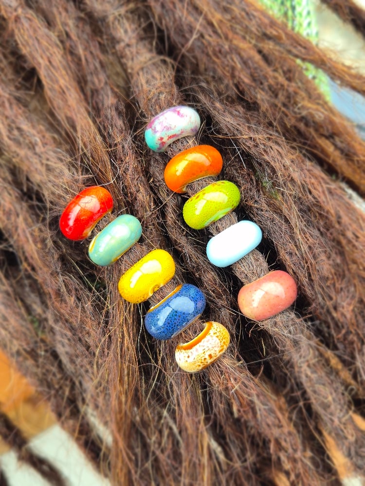 Set of 10 ceramic beads in a mix of stunning colours. These beads have a 6 mm hole, making them a good choice for many dreads.