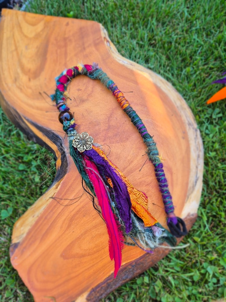 Created with love and positive intention, here at Riverbed Dreads. Woven layers of Sari Silk, recycled fabrics and beautiful threads in a mix of colours to make your heart sing! Charms and beads offer an extra touch of magic. With an elastic loop at the top, these one-of-a-kind wraps can be effortlessly looped into your dreadlocks in seconds, or tied into loose hair. This particular wrap is approximately 52 cm long.