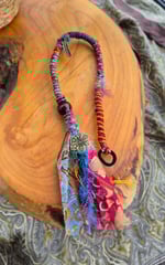 Created with love and intention, here at Riverbed Dreads. Woven layers of Sari Silk, recycled fabrics and beautiful threads in a mix of colours to make your heart sing! Charms and beads offer an extra touch of magic. With an elastic loop at the top, these one-of-a-kind wraps can be effortlessly looped into your dreadlocks in seconds, or tied into loose hair. This particular wrap is approximately 48 cm long.