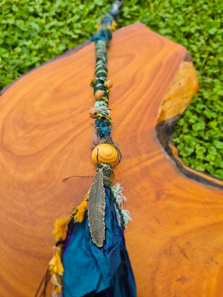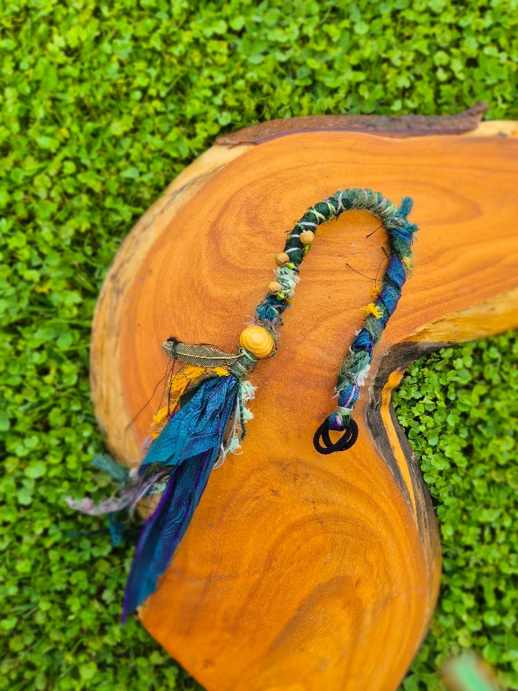 Created with love and positive intention, here at Riverbed Dreads. Woven layers of Sari Silk, recycled fabrics and beautiful threads in a mix of colours to make your heart sing! Charms and beads offer an extra touch of magic. With an elastic loop at the top, these one-of-a-kind wraps can be effortlessly looped into your dreadlocks in seconds, or tied into loose hair. This particular wrap is approximately 45 cm long.