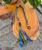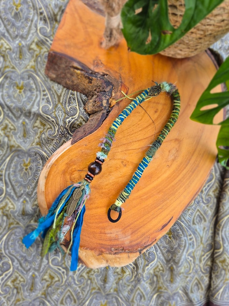 Created with love and positive intention, here at Riverbed Dreads. Woven layers of Sari Silk, recycled fabrics and beautiful threads in a mix of colours to make your heart sing! Charms and beads offer an extra touch of magic. With an elastic loop at the top, these one-of-a-kind wraps can be effortlessly looped into your dreadlocks in seconds, or tied into loose hair. This particular wrap is approximately 51 cm long.