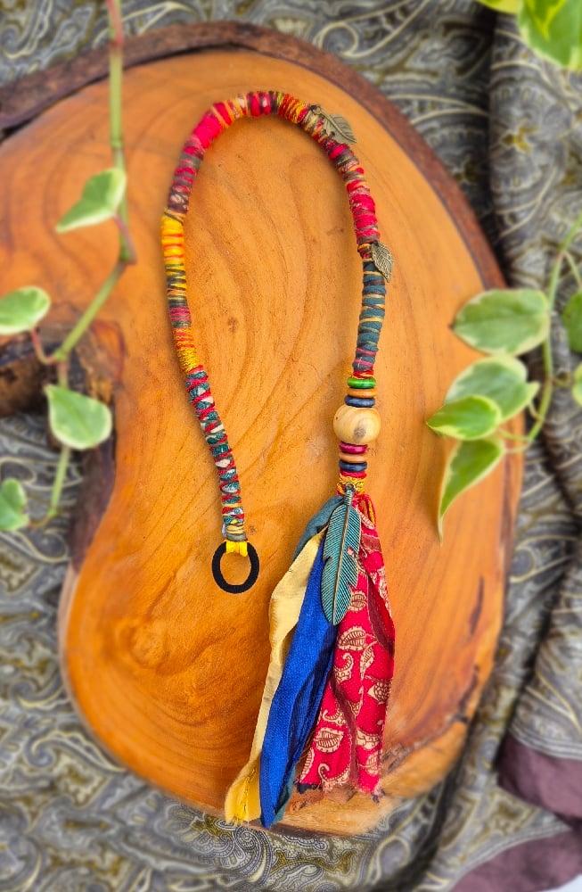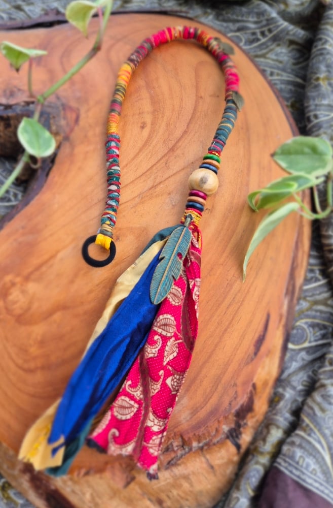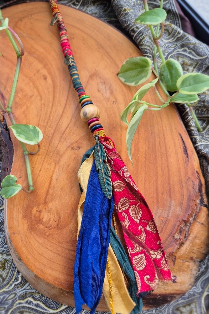 Created with love and intention, here at Riverbed Dreads. Woven layers of Sari Silk, recycled fabrics and beautiful threads in a mix of colours to make your heart sing! Charms and beads offer an extra touch of magic. With an elastic loop at the top, these one-of-a-kind wraps can be effortlessly looped into your dreadlocks in seconds, or tied into loose hair. This particular wrap is approximately 55 cm long.