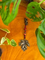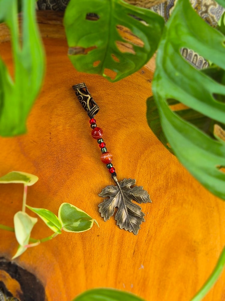 Gorgeous dreadlock dangle in bronze and autumny tones with a leafy charm. Crafted here at Riverbed Dreads! Featuring carnelian crystal to add a touch of magic and eye-catching detail to your dreads!