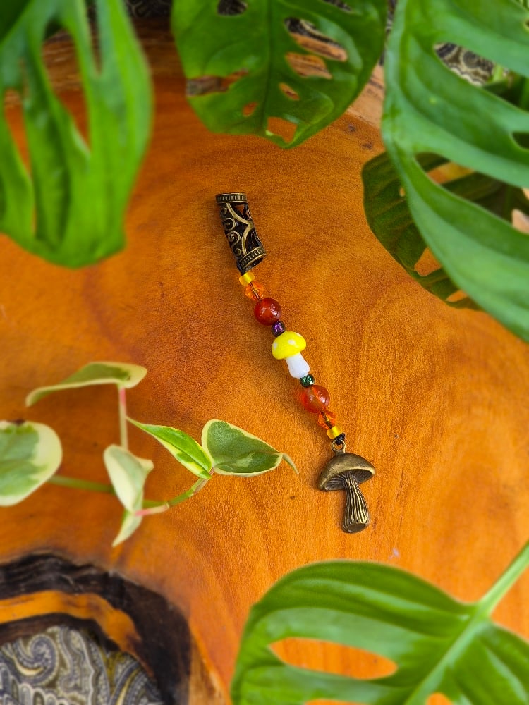 Gorgeous dreadlock dangle in bronze, oranges and yellows with a mushroom charm. Crafted here at Riverbed Dreads! Featuring carnelian crystal and a glass mushroom to add a touch of magic and eye-catching detail to your dreads!